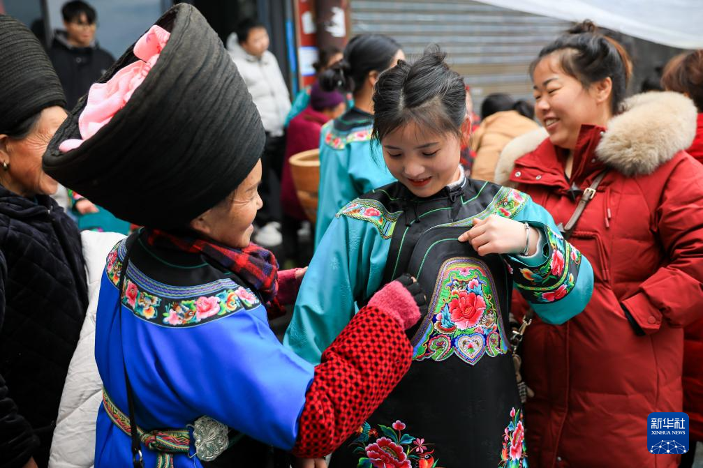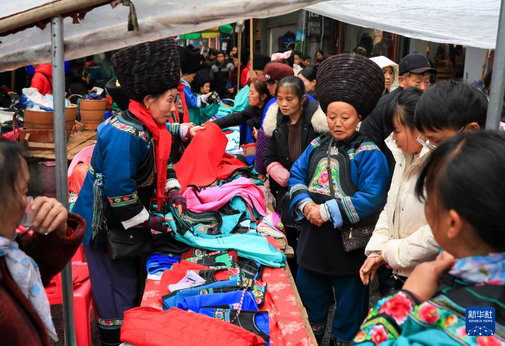 1月18日,顾客在湖南省凤凰县山江镇集市上选购苗服。