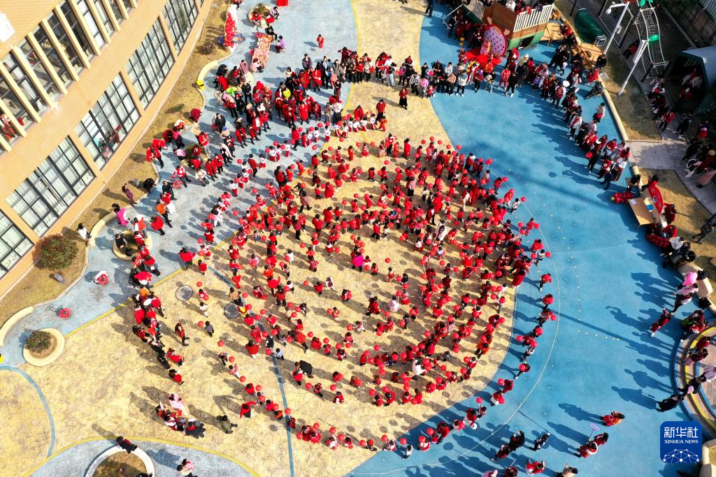 1月18日,浙江省东阳市南马镇花园村的花园外国语幼儿园师生举行主题为“春节的味道”迎新年活动(无人机照片)。