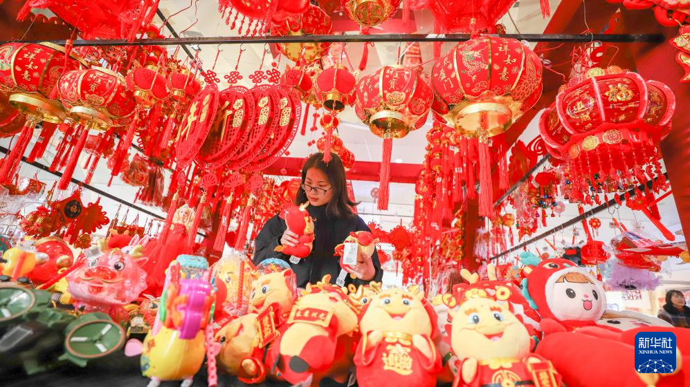 1月18日,市民在河北省唐山市海港经济开发区节庆年货市场选购迎春饰品。