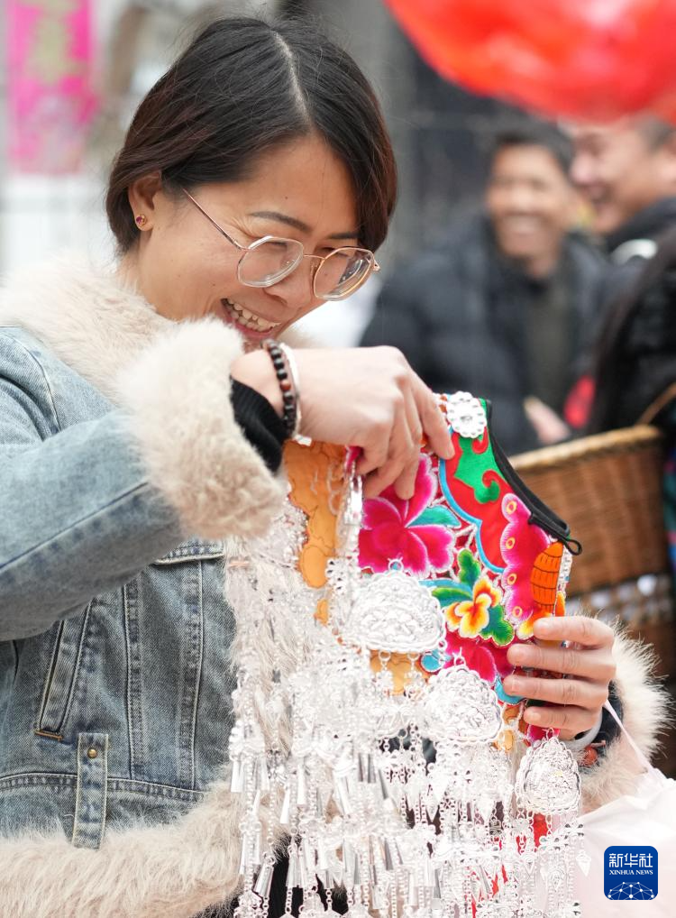 1月18日,顾客在湖南省凤凰县山江镇集市上选购苗族银饰。