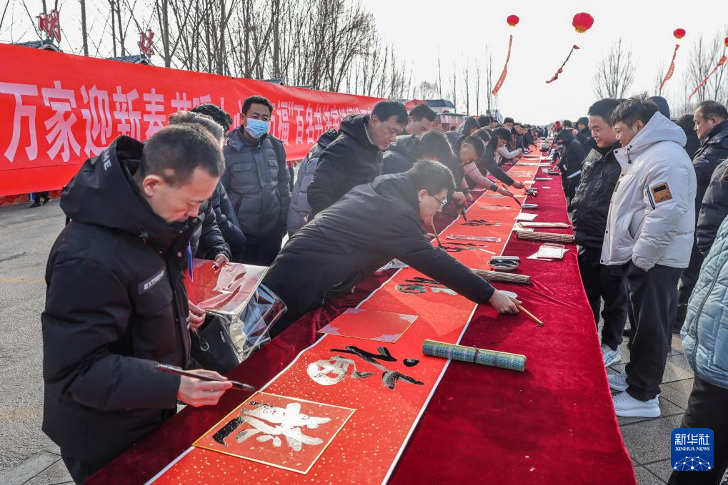1月18日,在山东省淄博市高青县举行的山东乡村文化旅游节启动仪式现场,书法爱好者为居民写福字。