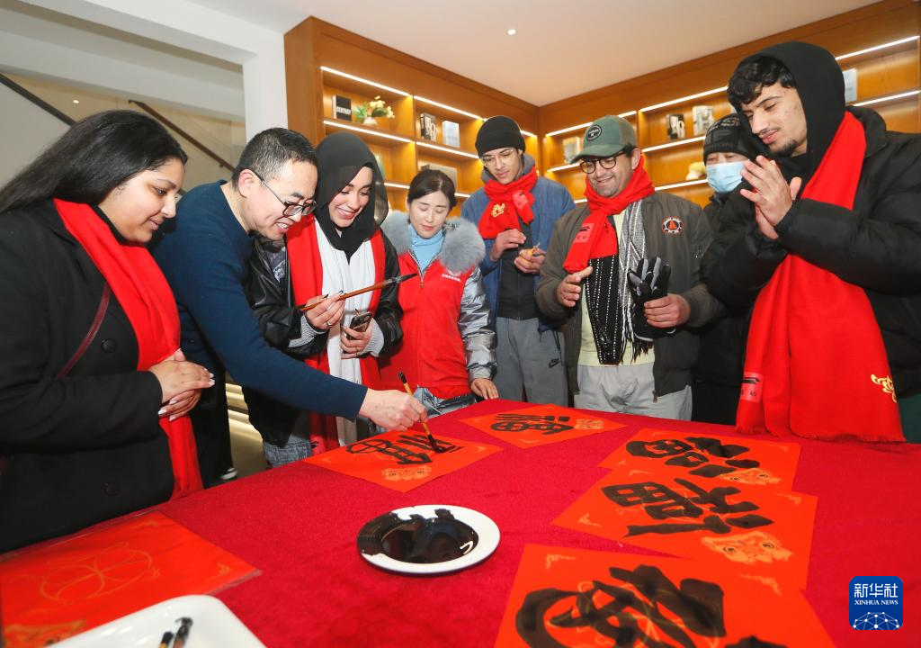 1月18日,“2024春节山东乡村文化旅游节”青岛启动仪式在即墨古城举办,这是书法爱好者与外国留学生一起写福字。