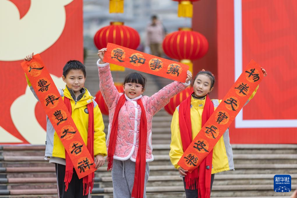 1月18日,重庆市永川区举办“书香永川·墨香万家”为主题的新春送万福进万家活动,组织当地书法家、民间文艺家及部分学校师生现场书写春联、写福字、做剪纸,并将其免费赠送给广大市民。这是小朋友展示领取的春联。