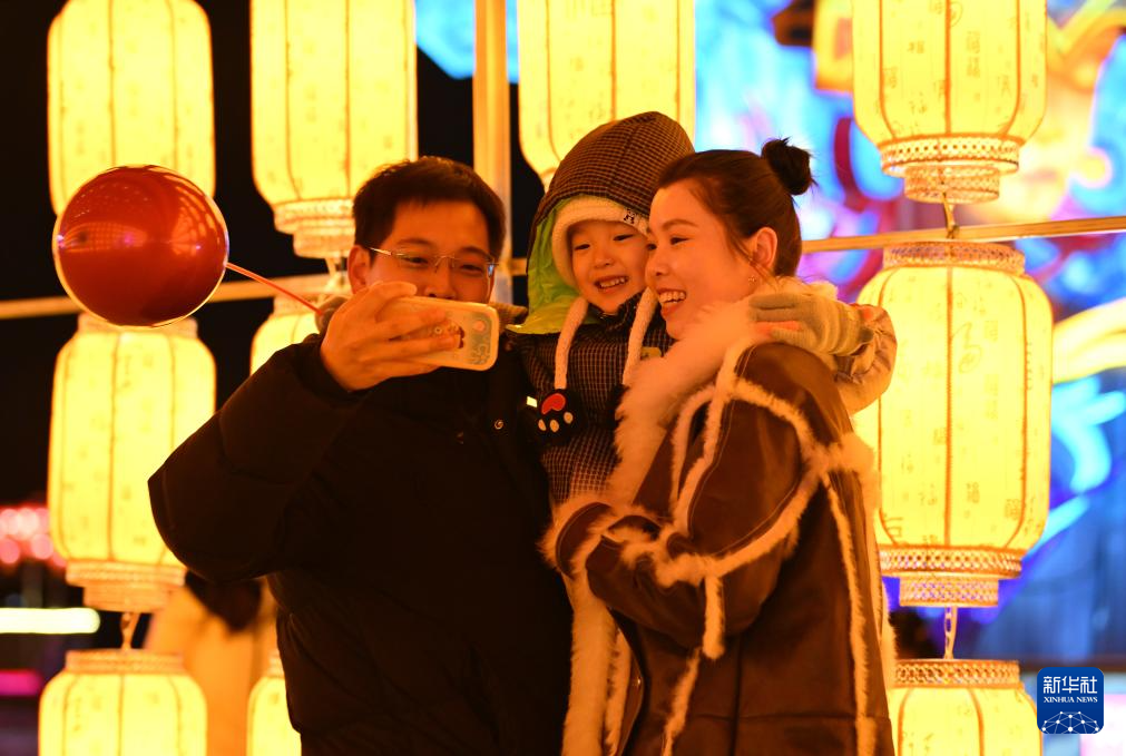 1月18日,天津市西青区杨柳青国潮灯展亮灯仪式在杨柳青镇举行。这是游人在灯展现场拍照留影。