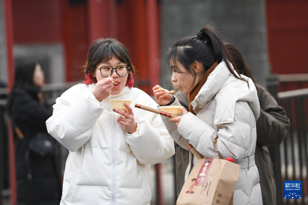 1月18日,人们在北京雍和宫品尝腊八粥。