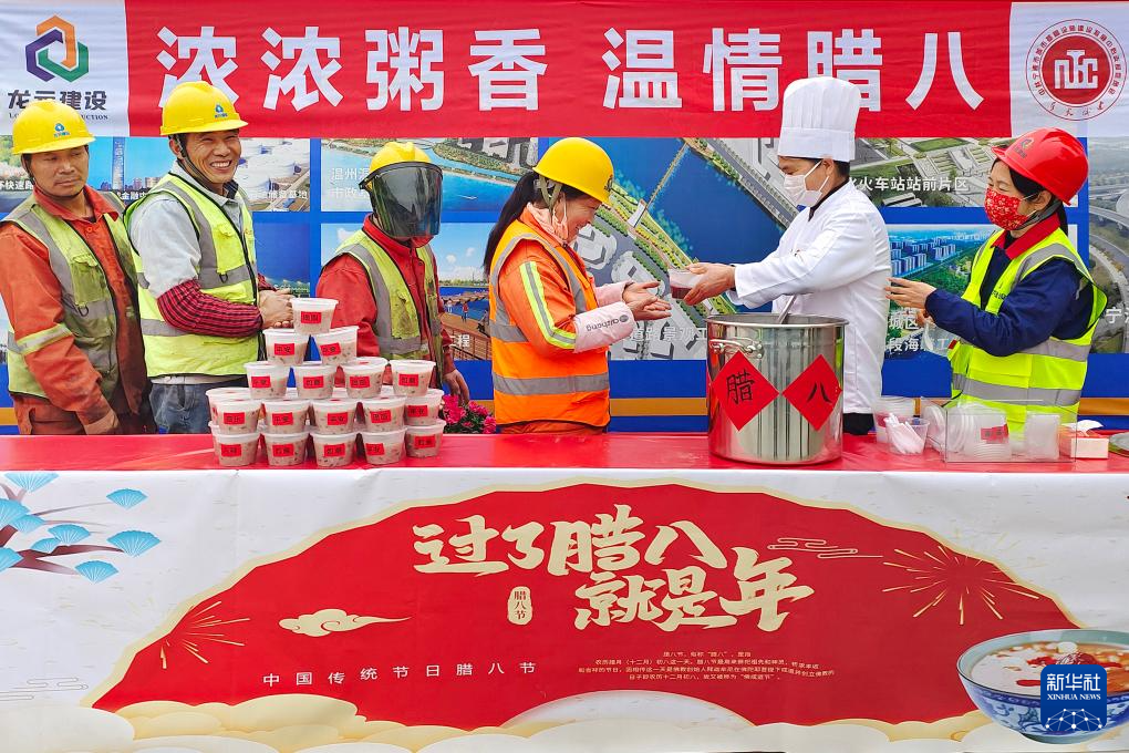 1月18日,浙江省宁波市镇海九龙大道快速路(北外环—东海大道)一期工程五标段项目工地的建设工人排队领取腊八粥。