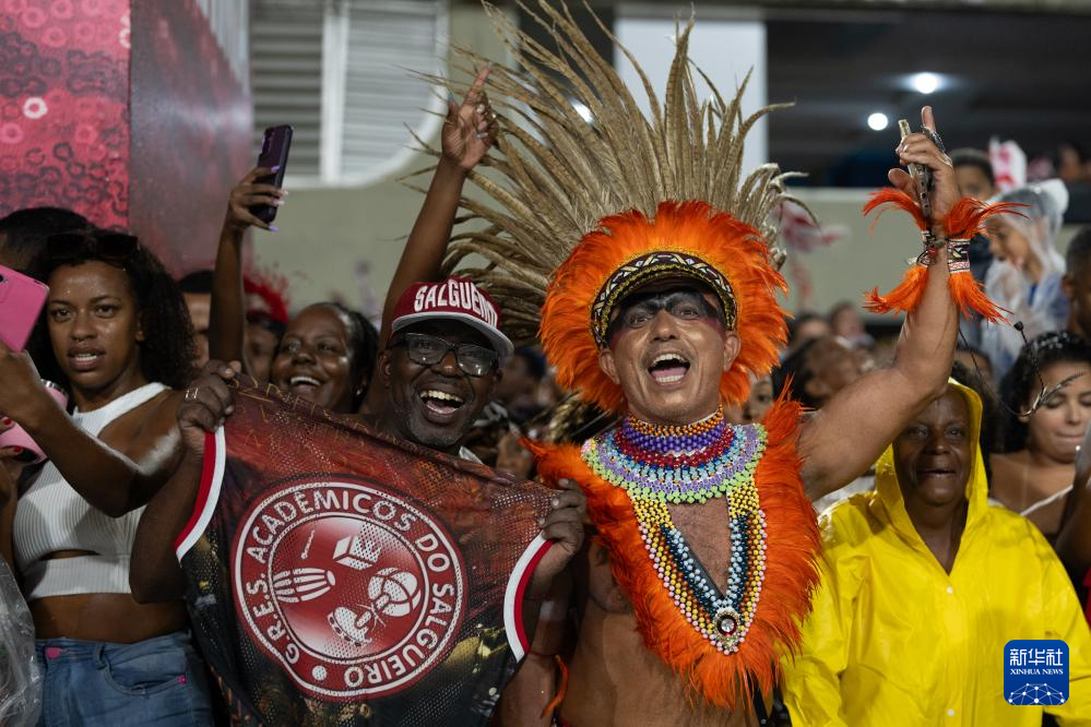 1月21日,在巴西里约热内卢桑巴大道,观众为其支持的桑巴舞校助威。