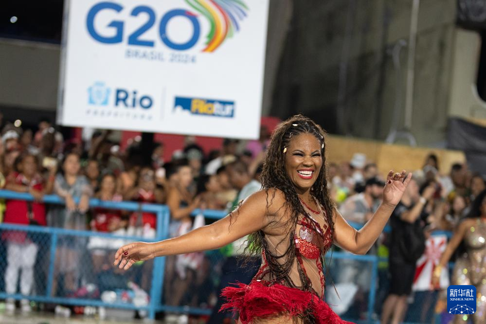 1月21日,在巴西里约热内卢桑巴大道举行的狂欢节彩排上,演员在一处带有“G20”标识的海报前表演。