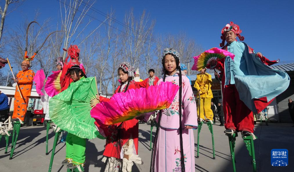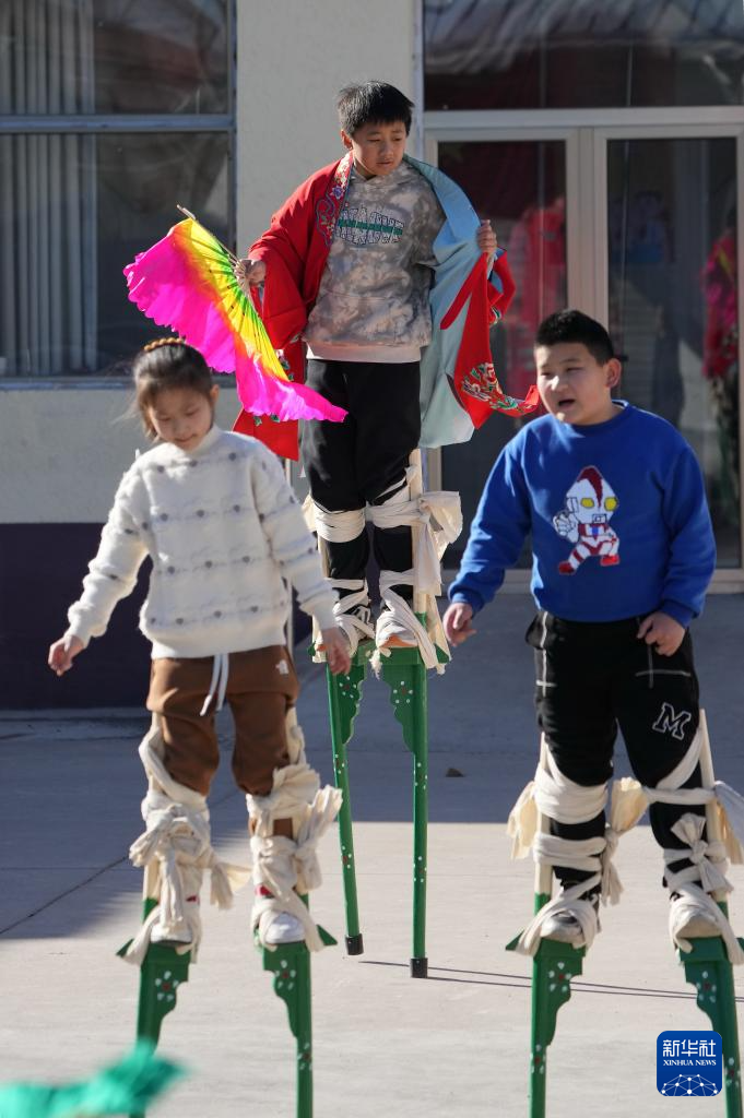 北京市大兴区魏善庄镇大狼垡村的孩子们在排练高跷(1月22日摄)。