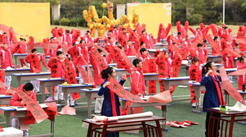 当日,江西省赣州市文清路小学举行师生集体写春联迎新春活动,学校师生在操场上挥毫泼墨,书写春联,迎接新春佳节。