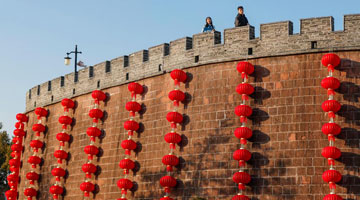 春节临近,安徽省黄山市歙县徽州古城挂起串串大红灯笼,洋溢着喜庆红火的节日氛围。