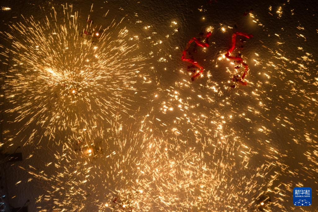 1月29日,在哈尔滨伏尔加庄园,铜梁火龙队的队员表演铜梁龙舞(无人机照片)。