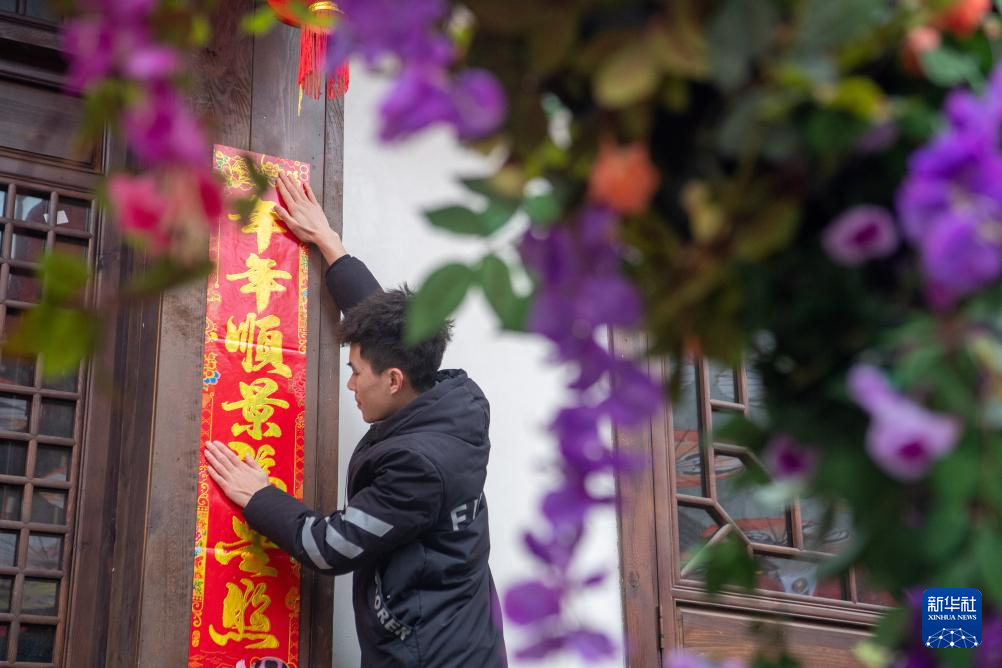 1月30日,雍溪古镇居民在老屋门前张贴春联。