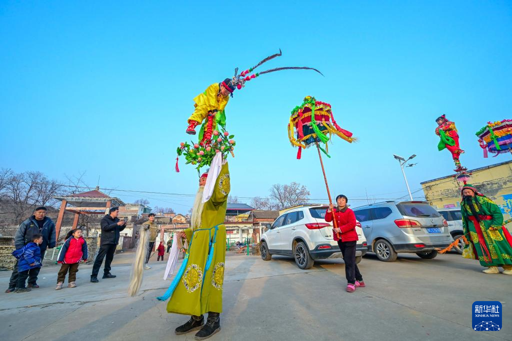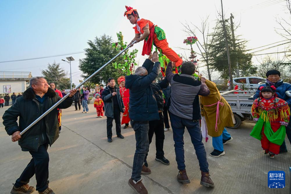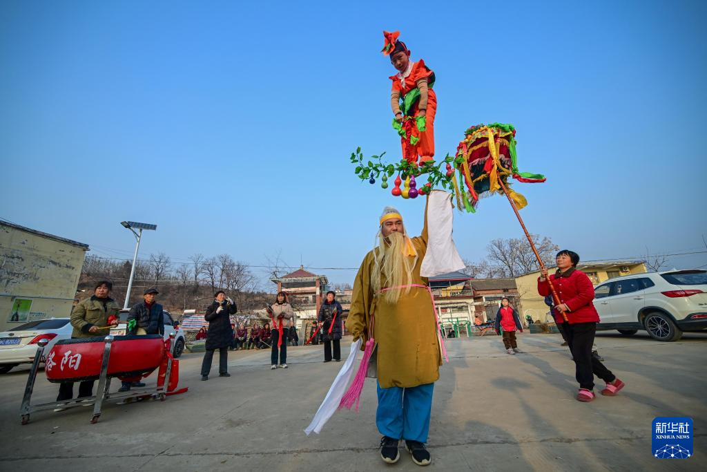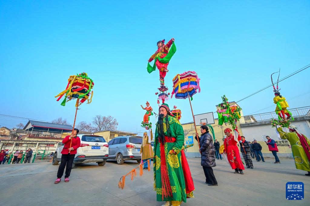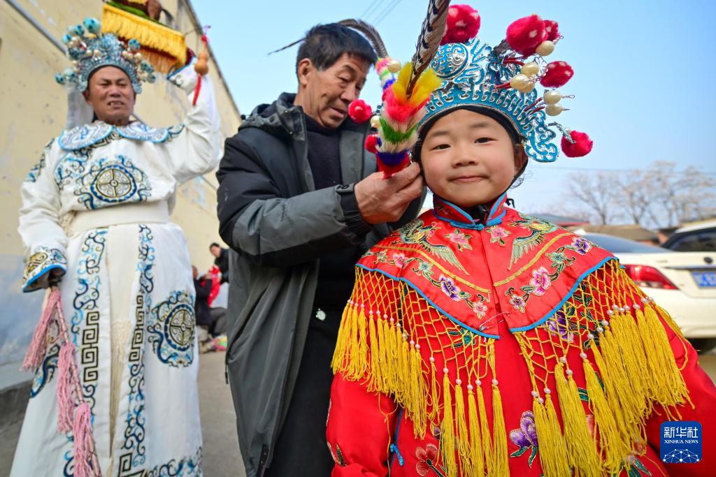 新春佳节临近,河南省洛阳市嵩县旧县镇的民间艺人忙着排练非遗旧县背装,为春节期间巡演准备。旧县背装是当地民间艺人在吸取戏剧、曲艺、舞蹈等多种艺术的基础上融合形成的造型艺术,多以表演故事为主,由成年人和小朋友共同表演。
