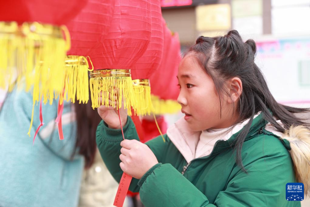 1月31日,在贵州省黔东南苗族侗族自治州岑巩县㵲水街道,小朋友在迎新春活动中参与猜灯谜。