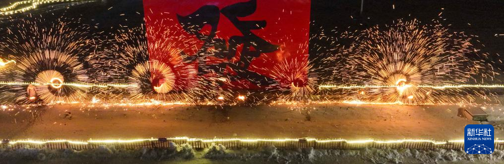 1月31日,民间艺人在河北省遵化市迎新春冰雪节上表演打铁花民俗节目(无人机照片)。