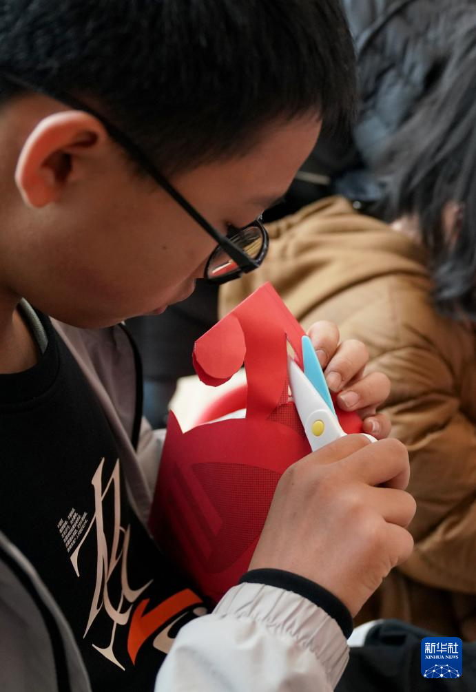 2月3日,一名小朋友在浙江自然博物院杭州馆体验剪纸。