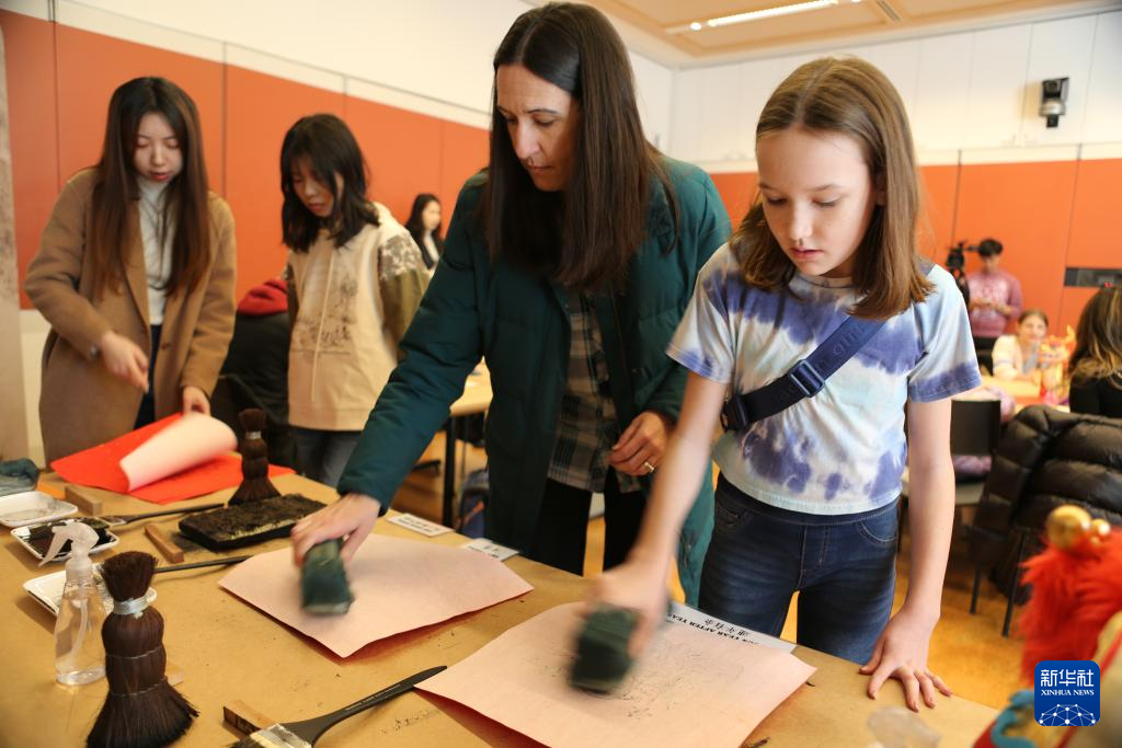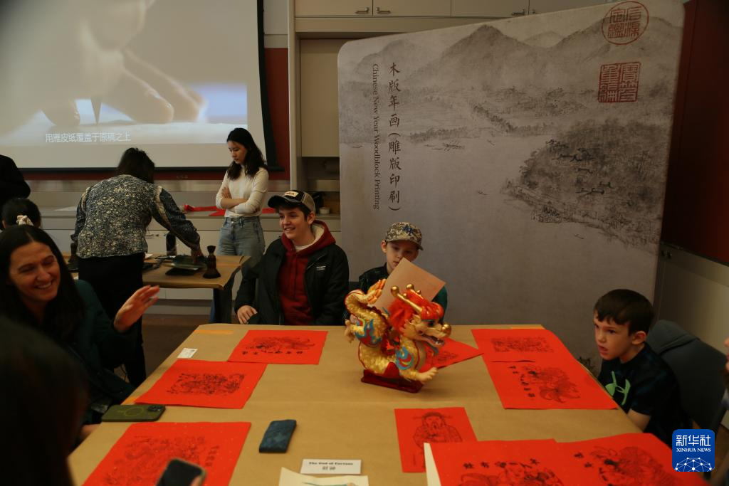2月3日,在美国纽约大都会艺术博物馆,参观者制作木版年画。