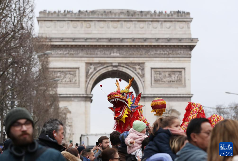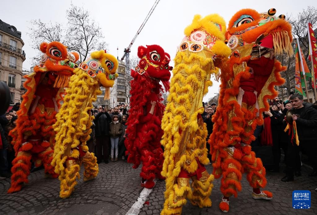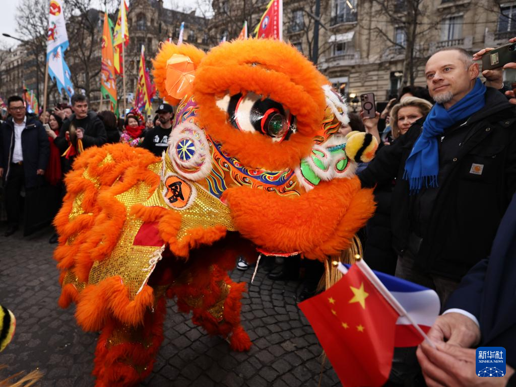 法国华人社区4日在巴黎香榭丽舍大街主办舞龙舞狮等表演活动,庆祝即将到来的龙年春节。