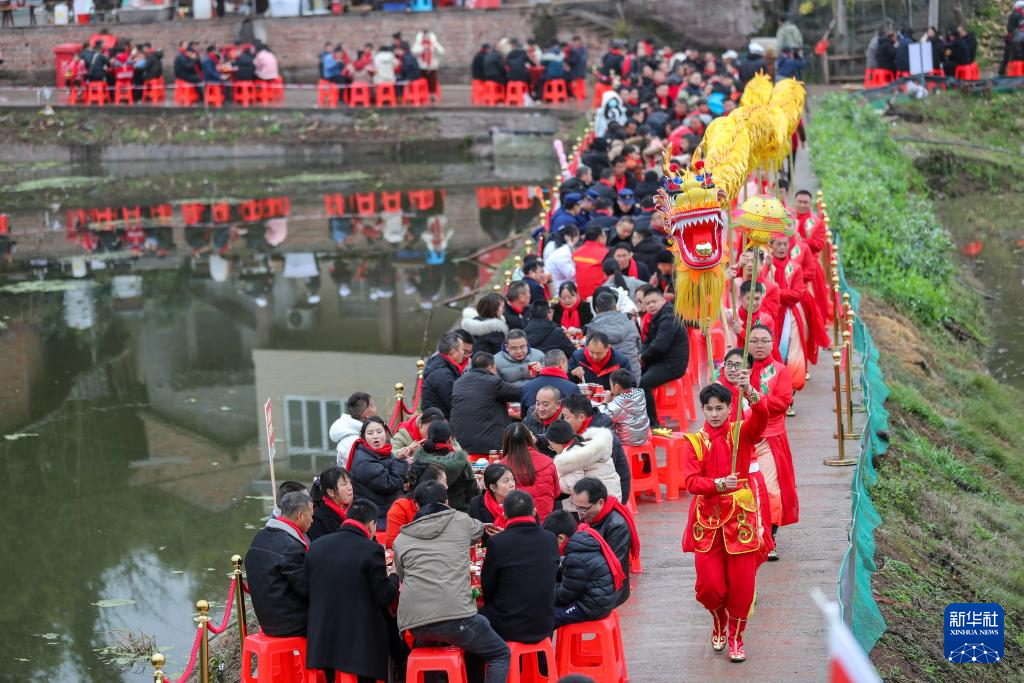2月5日,在四川省宜宾市南溪区裴石镇文化社区,村民一边吃团年饭,一边观看舞龙表演。