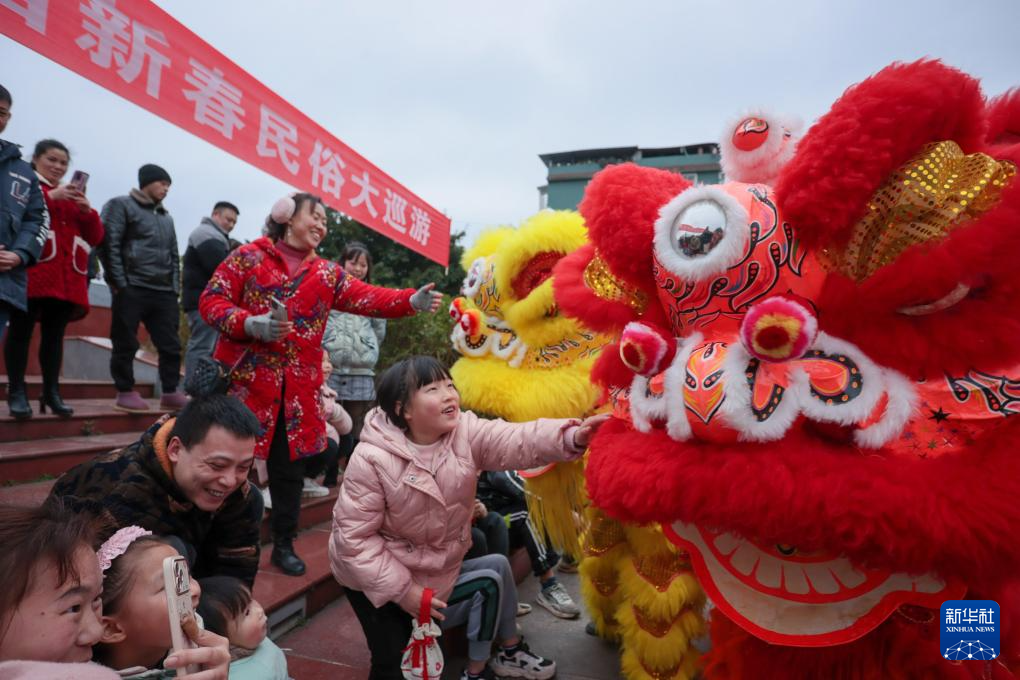 2月5日,在四川省遂宁市蓬溪县蓬南镇新春民俗大巡游活动现场,民间艺人表演舞狮并与小朋友互动。