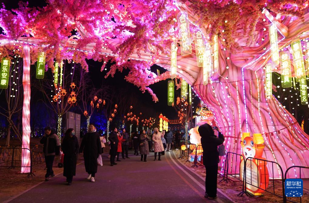 2月5日,游客在北京温榆河公园观灯赏景。