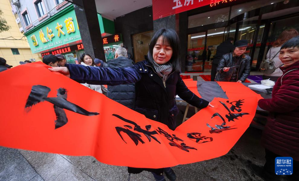 2月5日,市民在贵州省铜仁市玉屏侗族自治县年集上领取书法志愿者免费书写的春联。