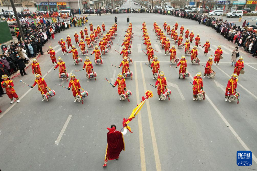 2月20日,在榆中县城关镇,兴隆山村社火队在表演太平鼓(无人机照片)。