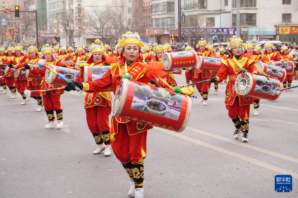 2月20日,在榆中县城关镇,兴隆山村社火队在表演太平鼓。