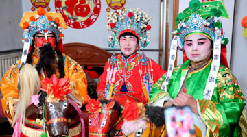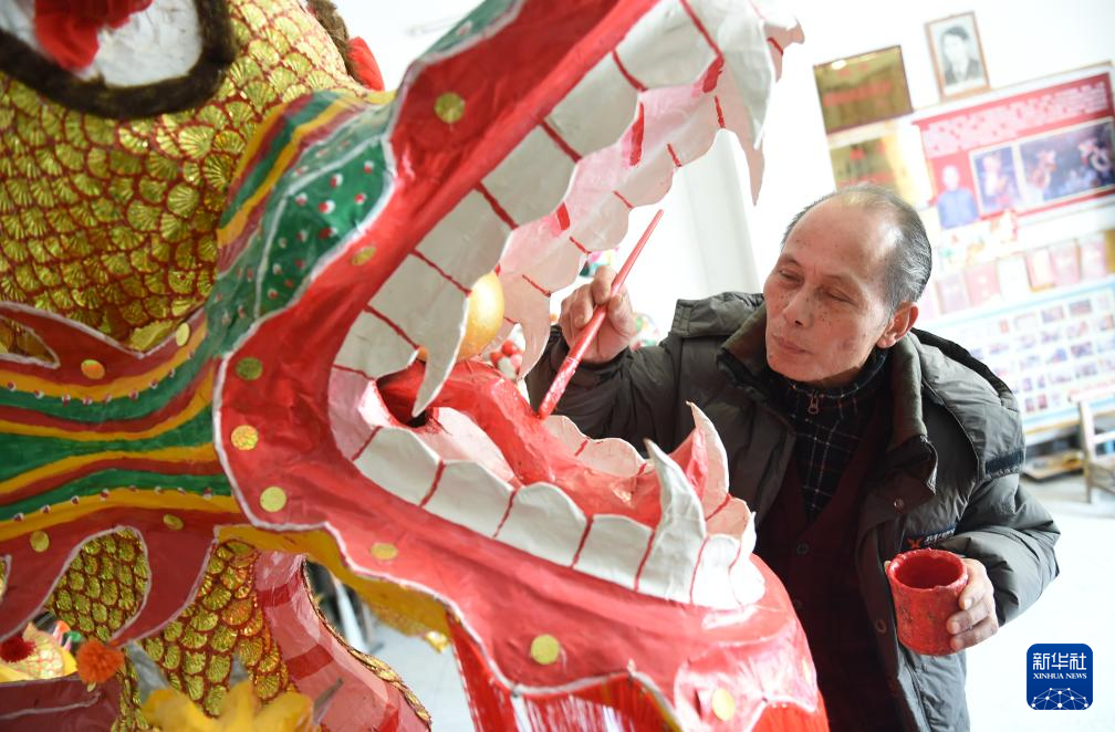 在广西宾阳县宾州镇,炮龙扎制艺人邹玉特在装饰炮龙(2016年2月16日摄)。