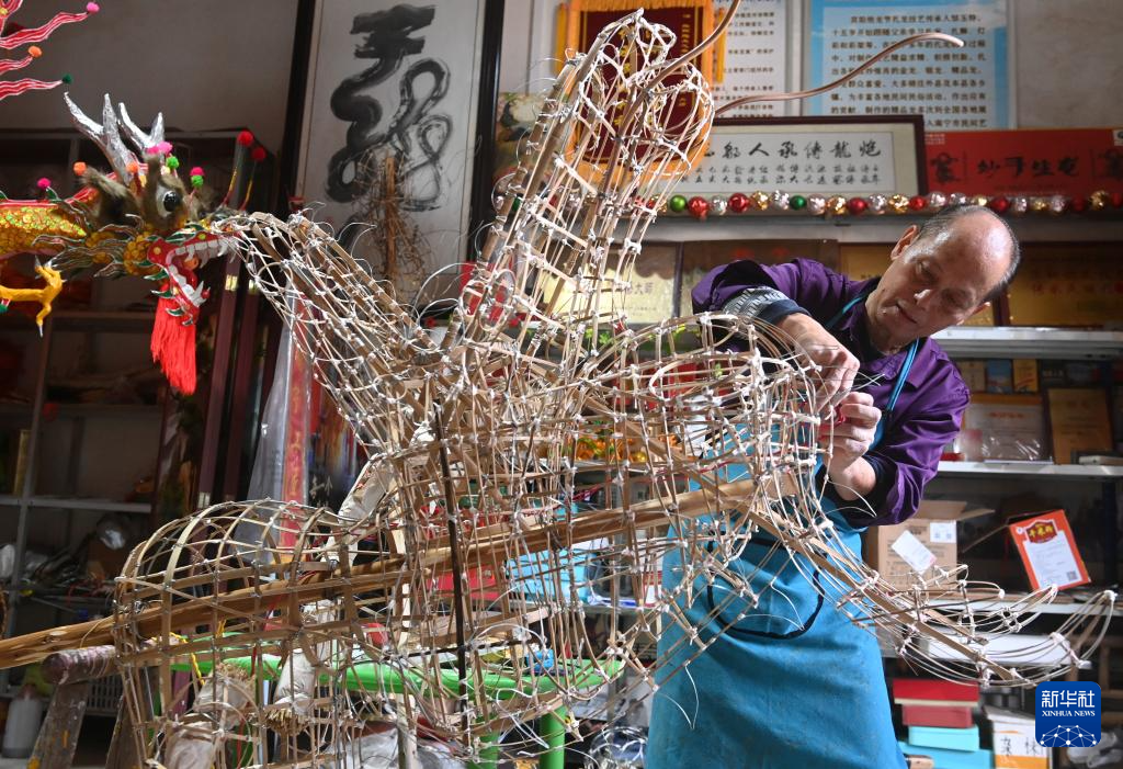 在广西宾阳县宾州镇三联街,炮龙扎制艺人邹玉特在扎制炮龙(2024年1月16日摄)。