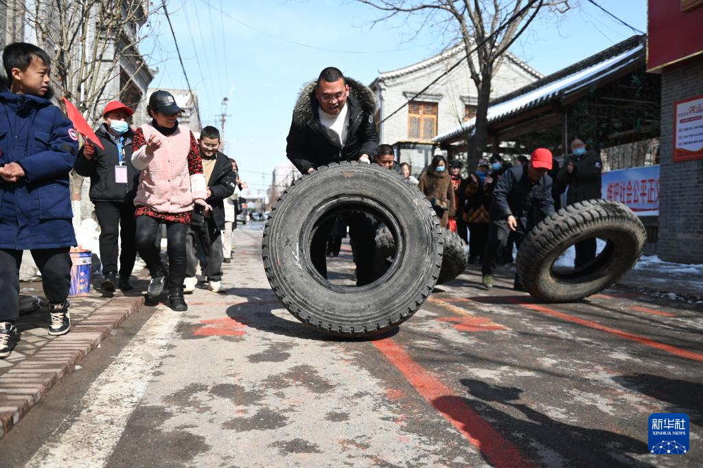 2月22日,村民在河北省邯郸市邯山区河沙镇镇南街村参加翻轮胎比赛。