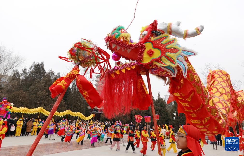 2月22日,社火队员在甘肃省定西市安定区市民公园表演舞龙。