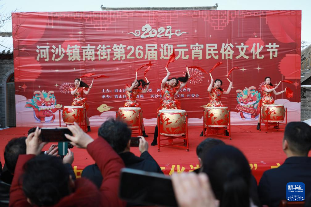 2月22日,村民在河北省邯郸市邯山区河沙镇镇南街村表演《网红战鼓》。