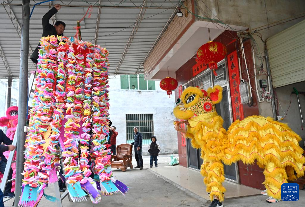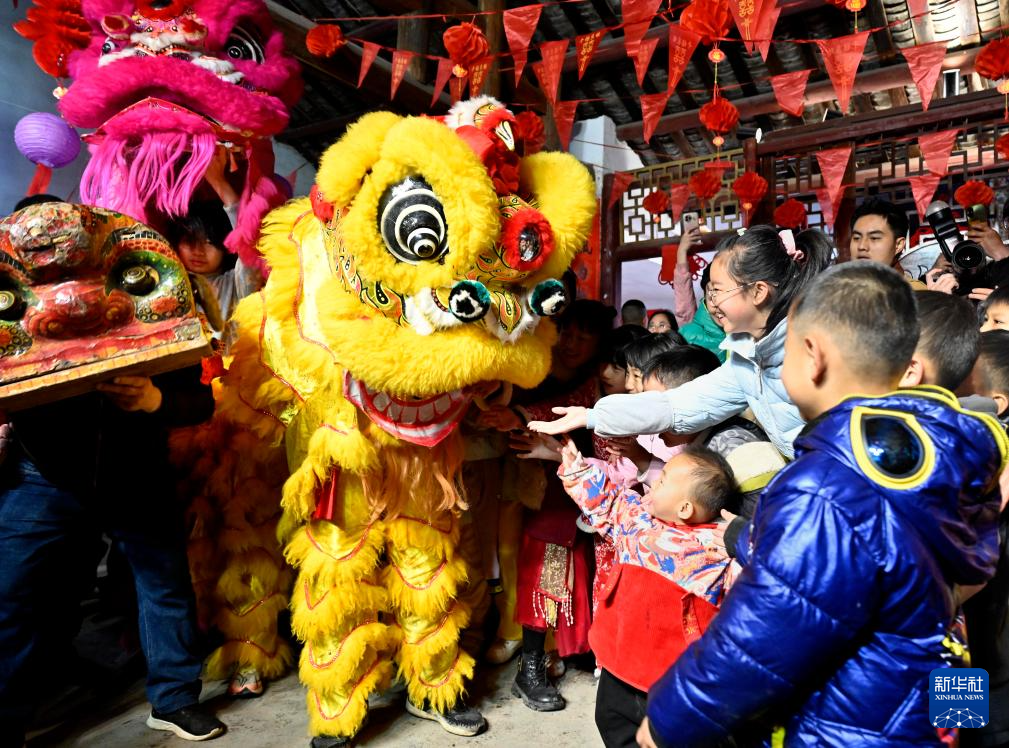 2月22日,广西柳州市柳江区进德镇举行“上花灯”系列民俗闹元宵活动。这是舞狮艺人向小朋友派发礼物。