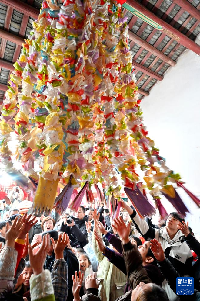 2月22日,在浙江省金华市武义县俞源乡俞源古村,村民在举行传统民俗活动“擎台阁”。