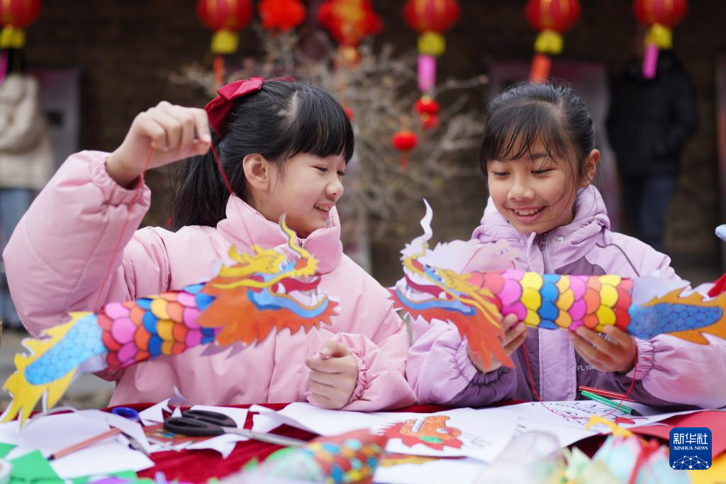 2月21日,在广西桂林市灵川县定江镇路西村,小朋友在迎元宵活动上制作花灯。