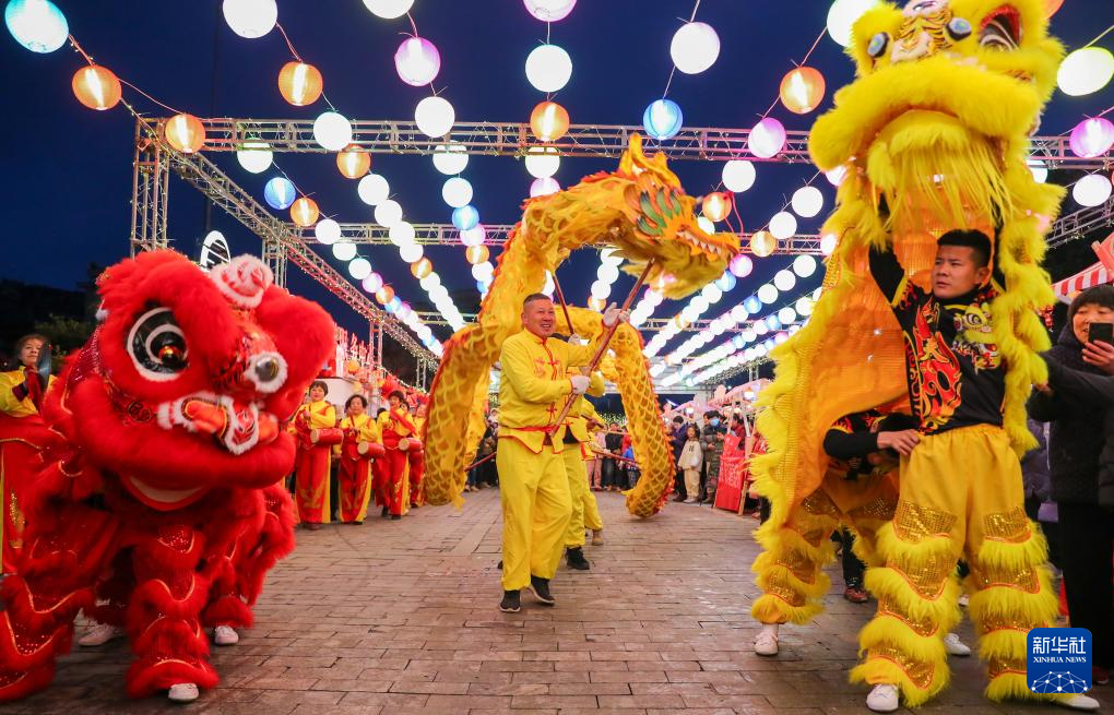 2月22日,在浙江省湖州市德清县阜溪街道三桥社区,人们在元宵灯会上欣赏舞龙、舞狮表演。