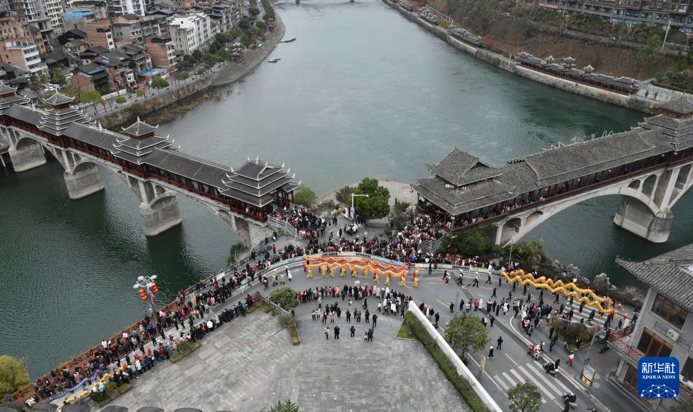 2月22日,在贵州省黔东南苗族侗族自治州锦屏县,舞龙队经过两座风雨桥的交汇处。