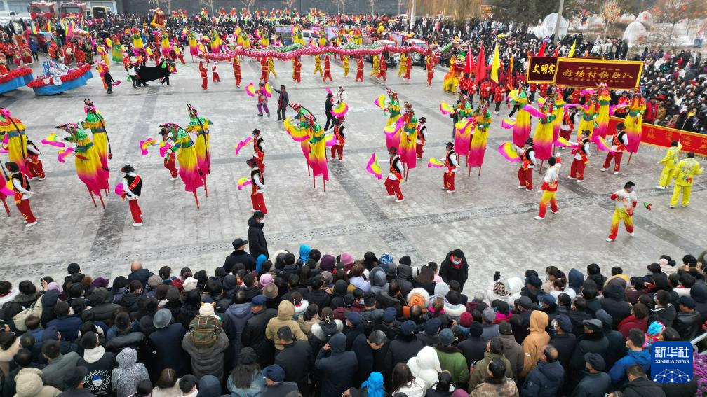 2月22日,秧歌队员在甘肃省和政县聚兴广场表演秧歌(无人机照片)。