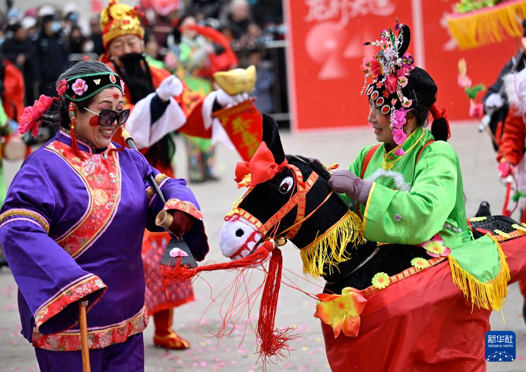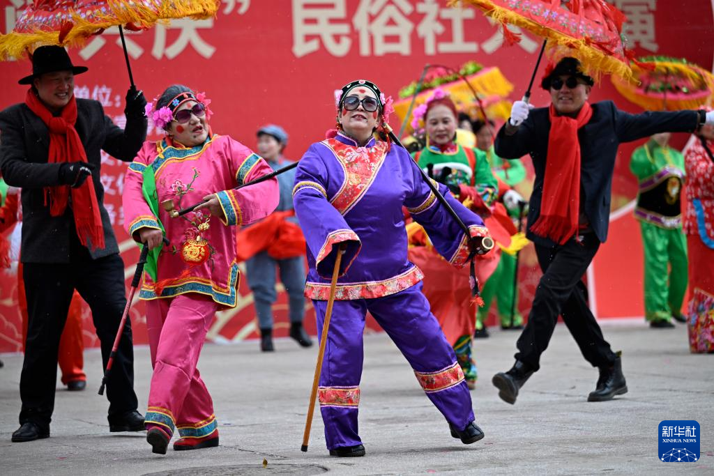 2月20日,在宁夏银川市,参赛社火队的演员为市民表演传统社火项目(无人机照片)。