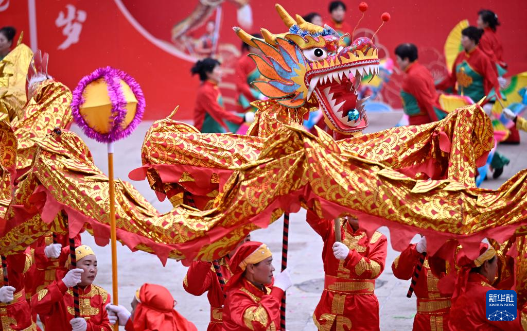 2月20日,在宁夏银川市,参赛社火队的演员为市民表演舞龙。