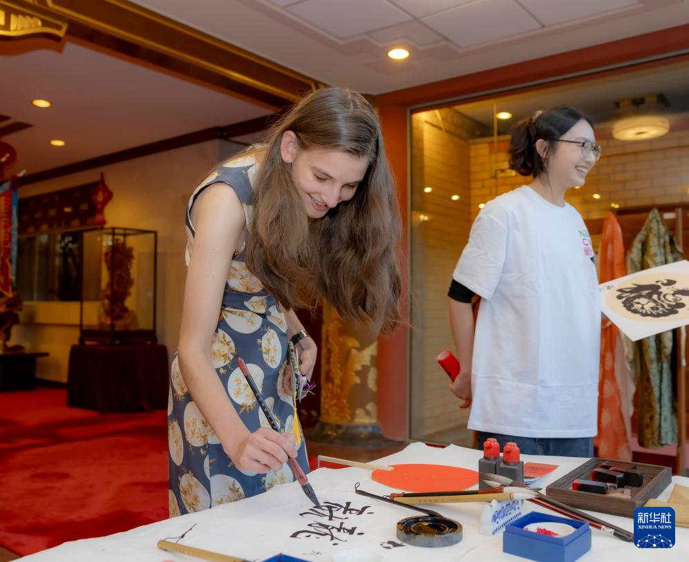 2月27日,在澳大利亚堪培拉中国驻澳大利亚大使馆,来宾体验中国书法。