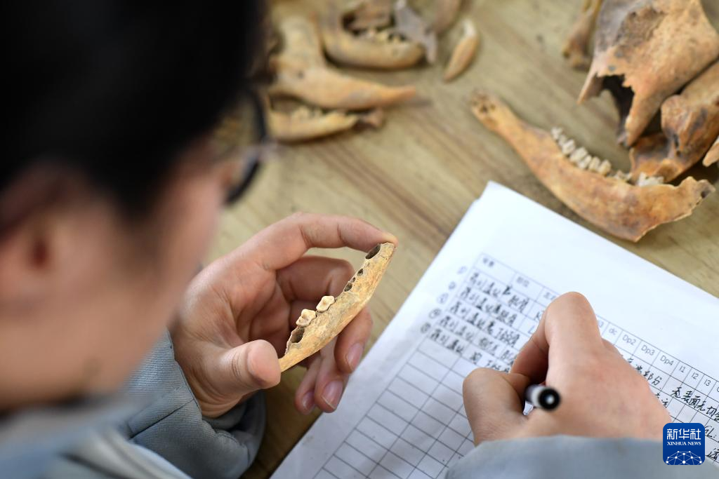3月5日,陕西省考古研究院女子考古队队员王红英在动物骨骼实验室登记考古出土的动物骨骼信息。