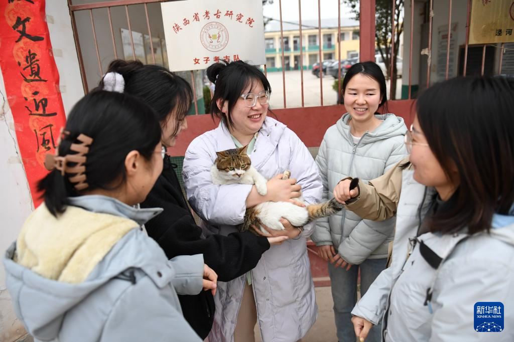 3月5日,陕西省考古研究院女子考古队的成员们抱着队猫“富贵”聊天玩耍。