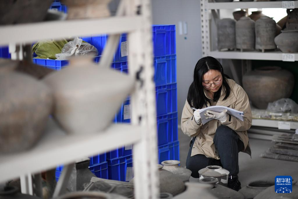3月5日,陕西省考古研究院女子考古队队员张佳杨在文物库房登记文物信息。