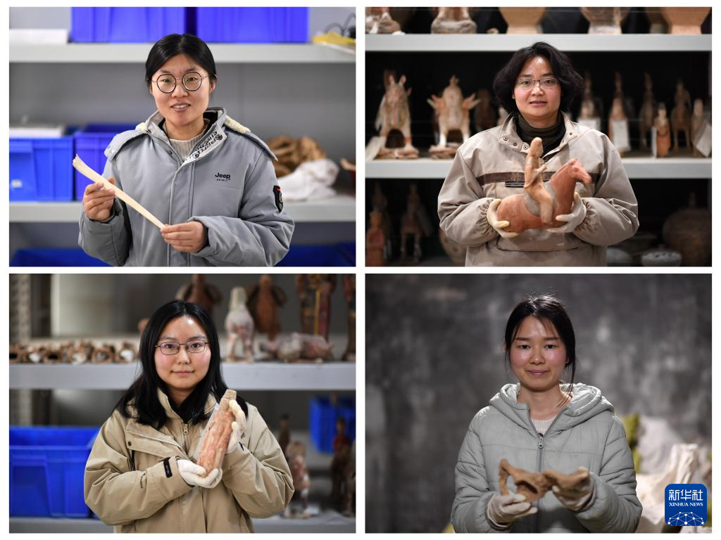 3月5日拍摄的陕西省考古研究院女子考古队员王红英(左上)、王小娟(右上)、张佳杨(左下)、郭结(右下)在考古队驻地(拼版照片)。