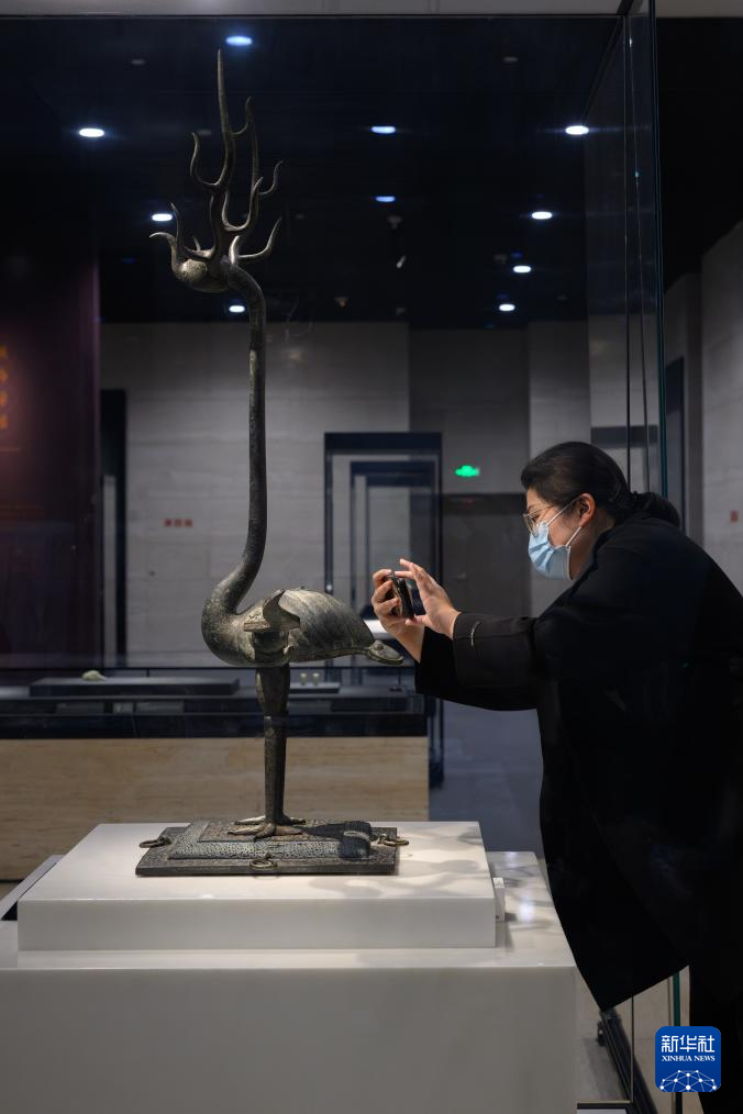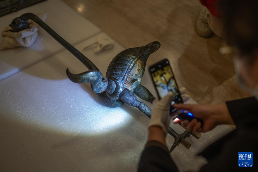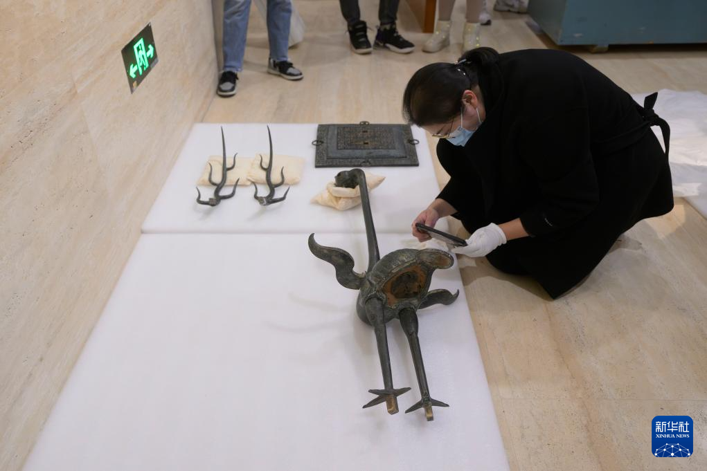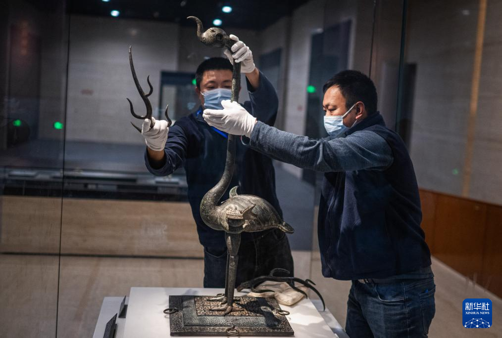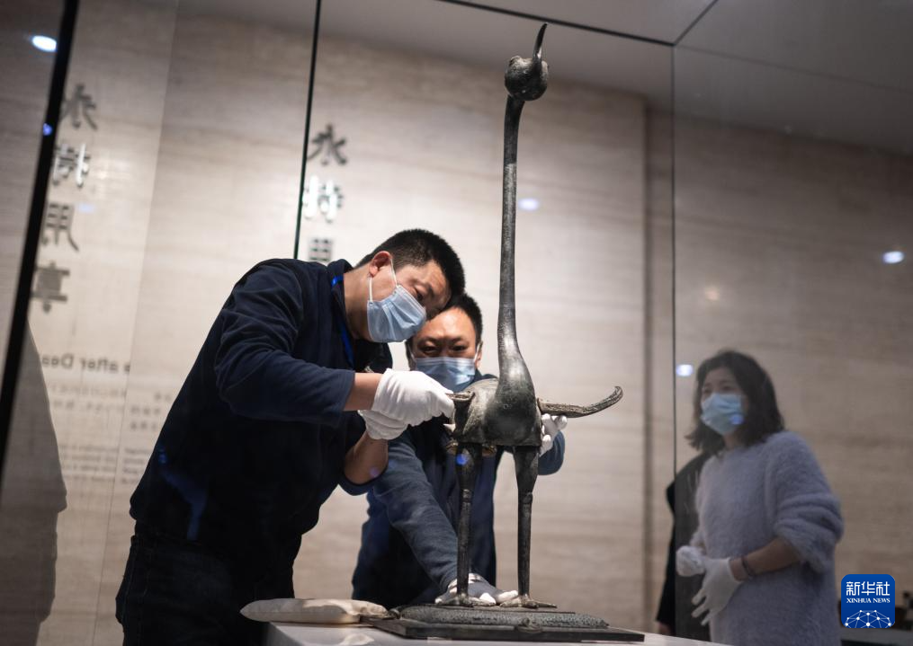 在湖北省博物馆曾侯乙展厅,工作人员对铜鹿角立鹤进行点交(3月4日摄)。