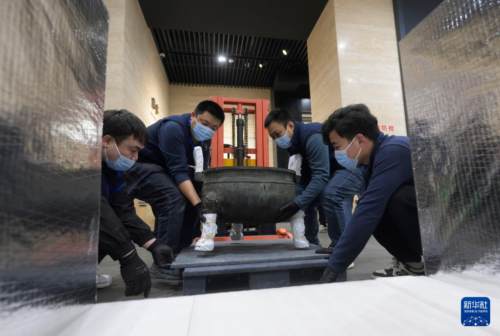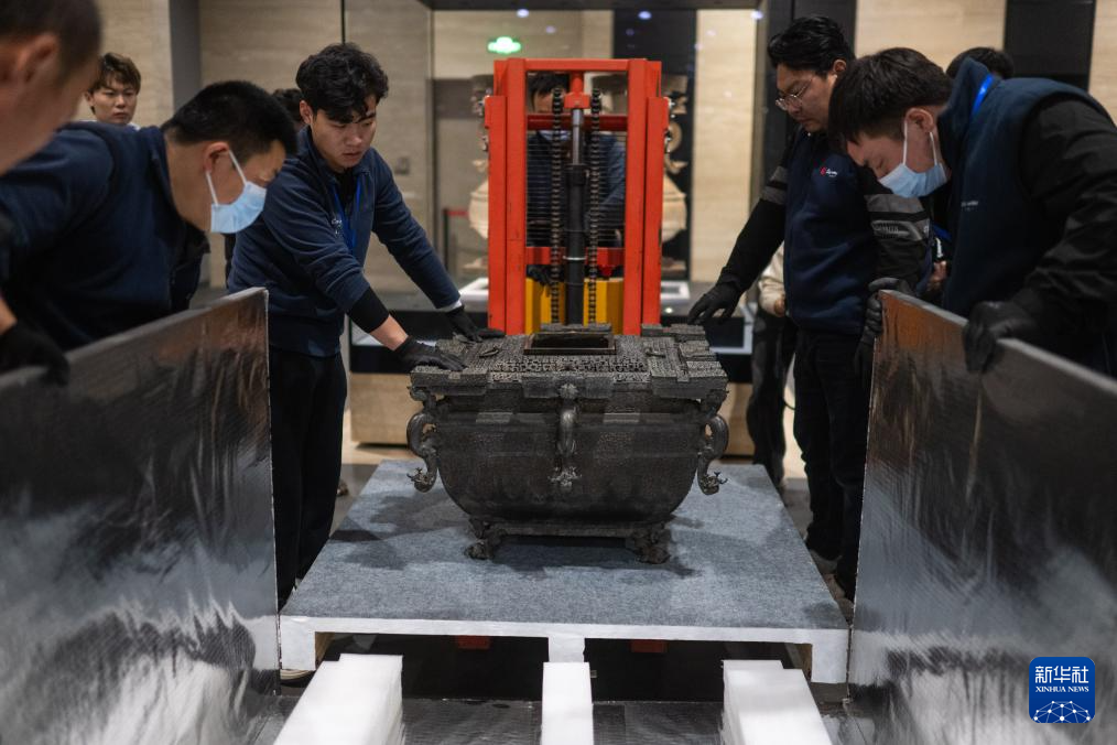 在湖北省博物馆,工作人员在对文物铜镬鼎进行打包装箱(3月4日摄)。