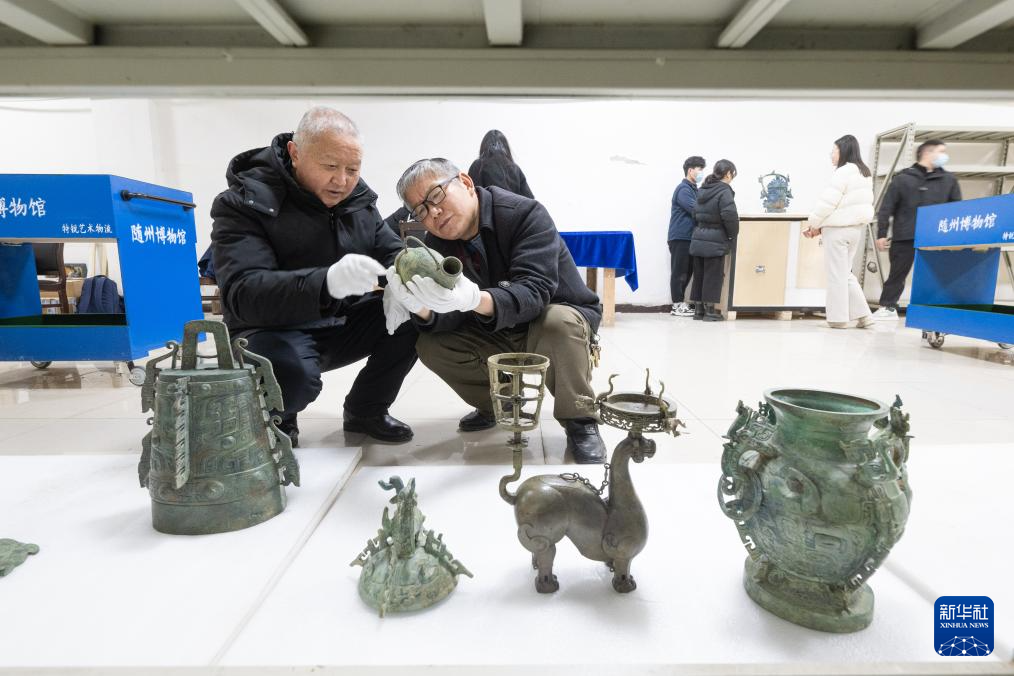 在湖北随州博物馆,工作人员对展出的文物进行点交(2月27日摄)。